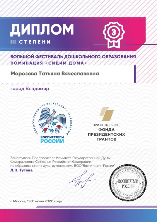 • Призер (III место) Большого фестиваля дошкольного образования "Воспитатели России" в номинации "Сидим дома", июнь 2020г.