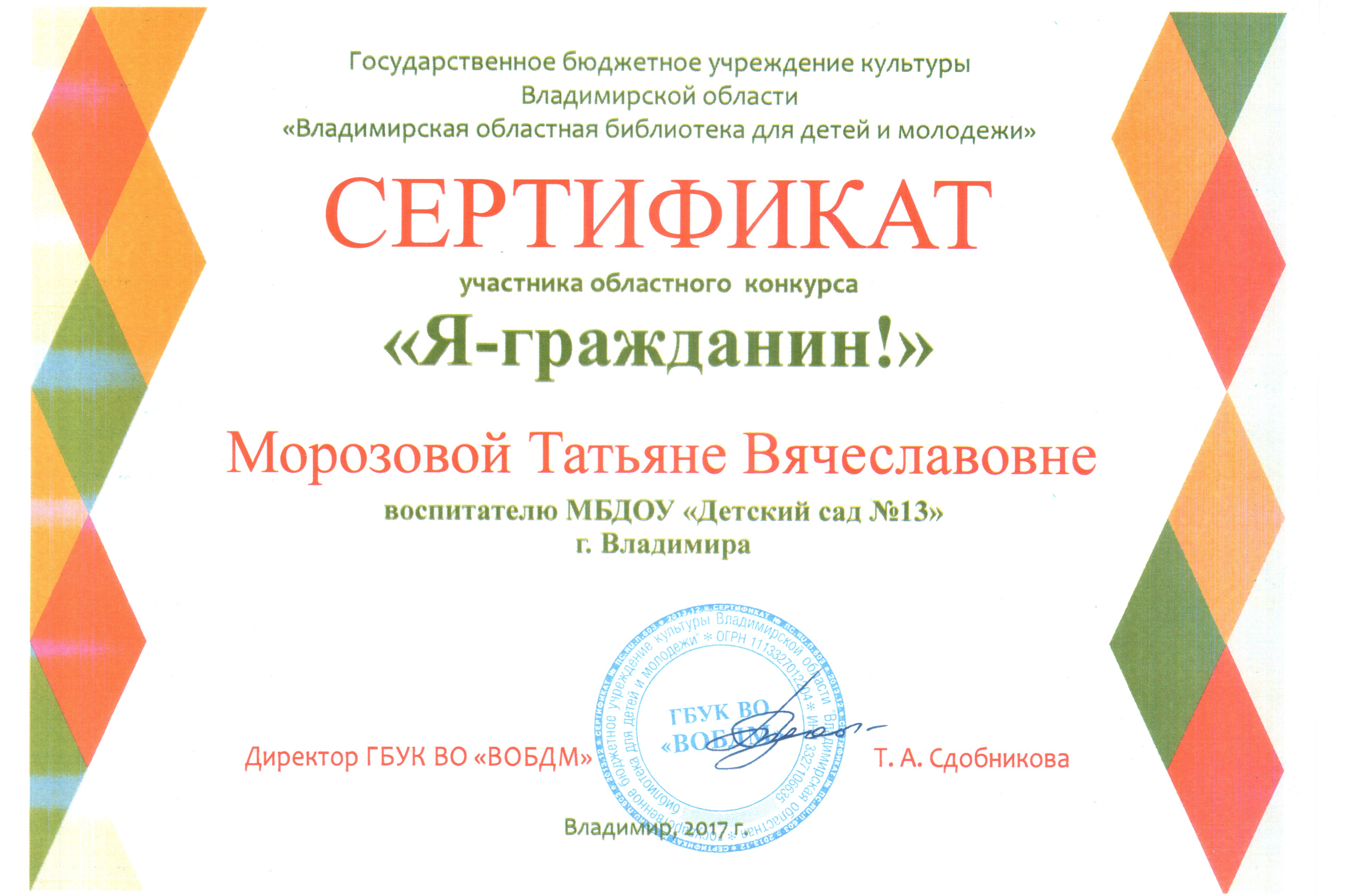 - 2017г. - Благодарность Новосибирского центра продуктивного обучения центрального оргкомитета международного игрового конкурса "Человек и природа" за активную работу по организации и проведению конкурса в МБДОУ "Детский сад №13" г.Владимира;