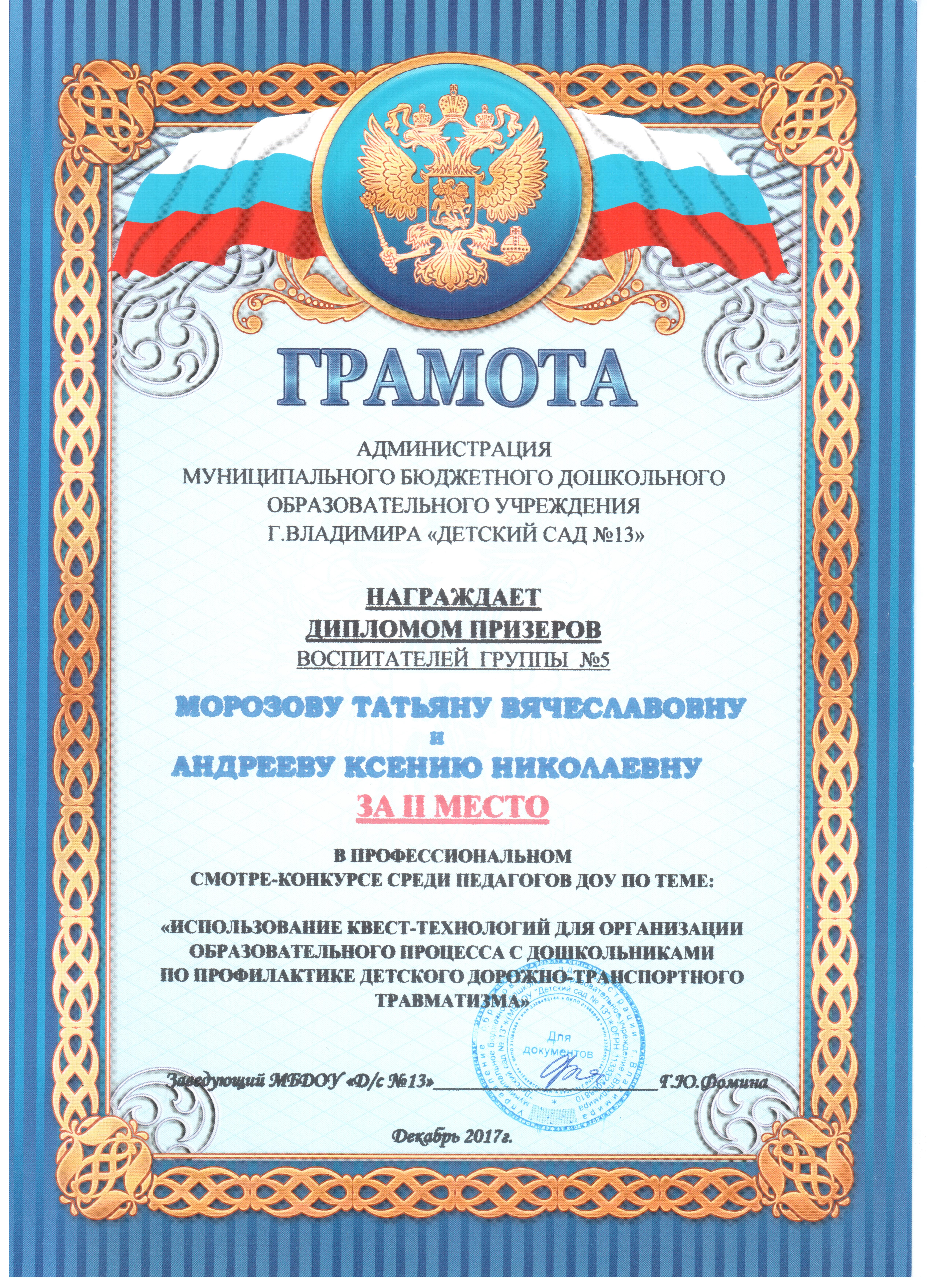 • Призер (II место) в профессиональном смотре-конкурсе среди педагогов ДОУ по теме «Использование квест-технологий для организации образовательного процесса с дошкольниками по профилактике детского дорожно-транспортного травматизма», декабрь 2017г.