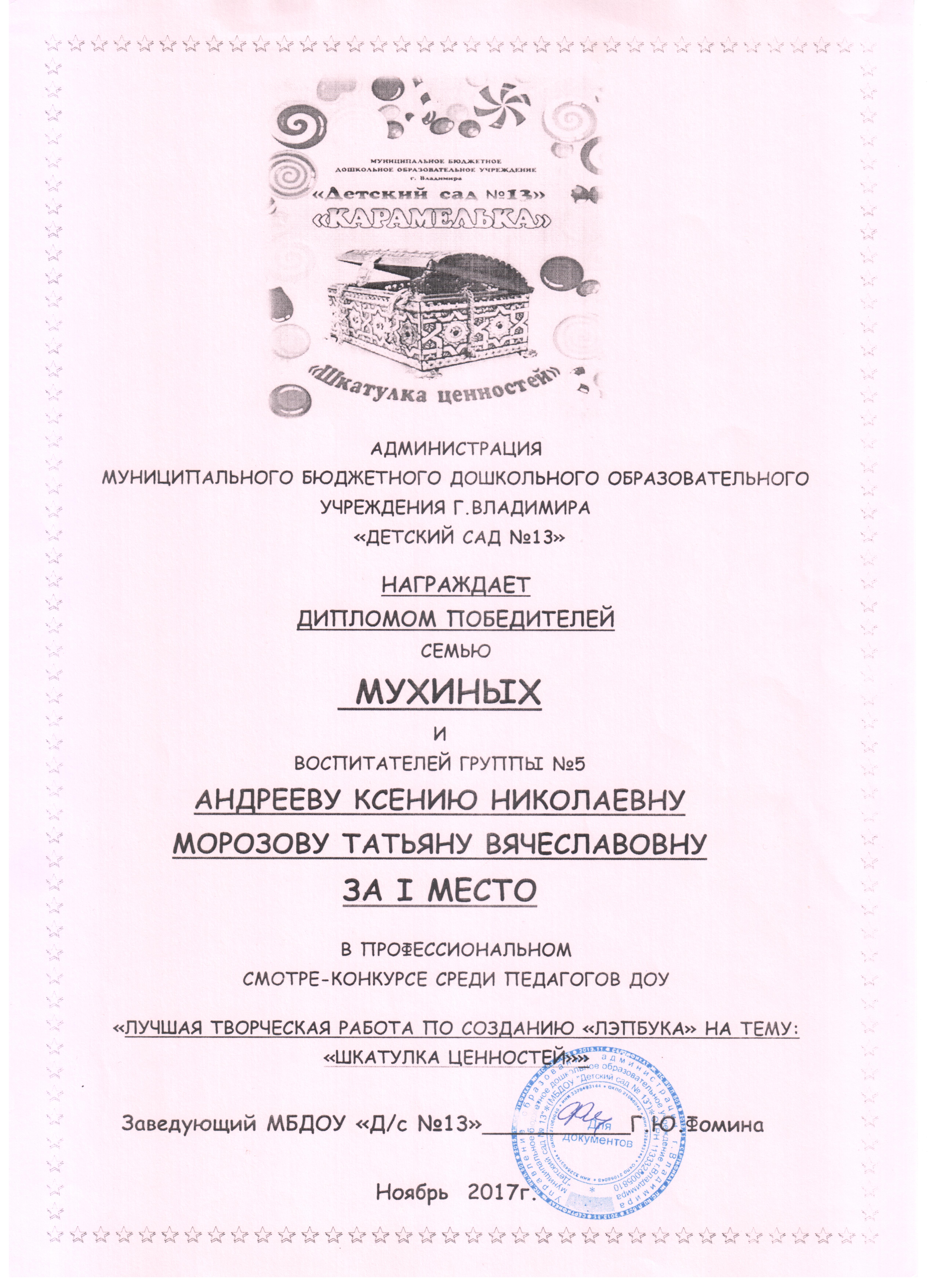• Победитель (I место) в профессиональном смотре-конкурсе среди педагогов ДОУ «Лучшая творческая работа по созданию «Лепбука» на тему «Шкатулка ценностей», ноябрь 2017г.