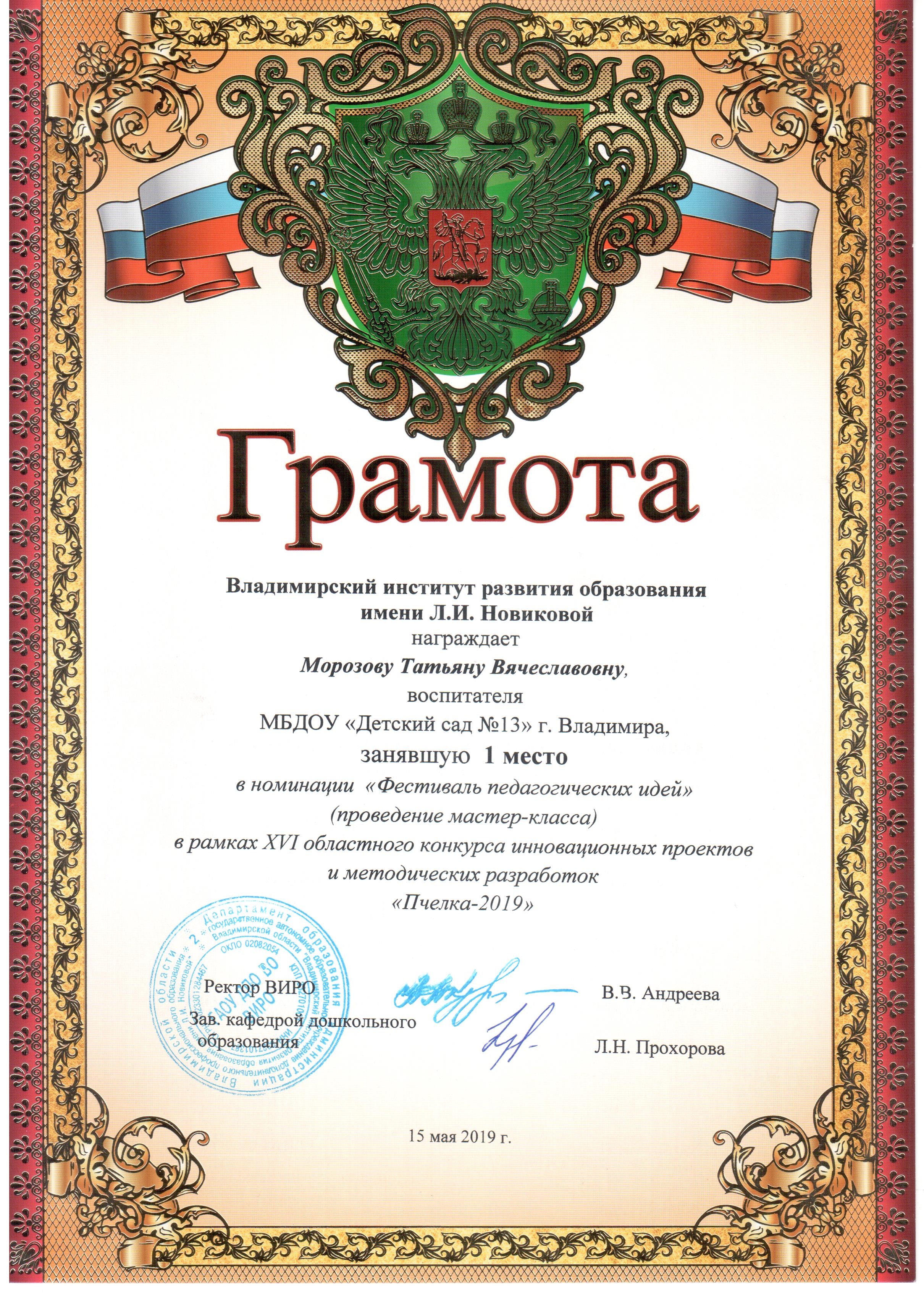- 2019г. (февраль) - благодарность Владимирского института развития образования им. Л.И Новиковой за неоднократное проведение мастер-классов для педагогов ДОУ на тематических курсах "Формирование позитивных установок к разным видам труда";