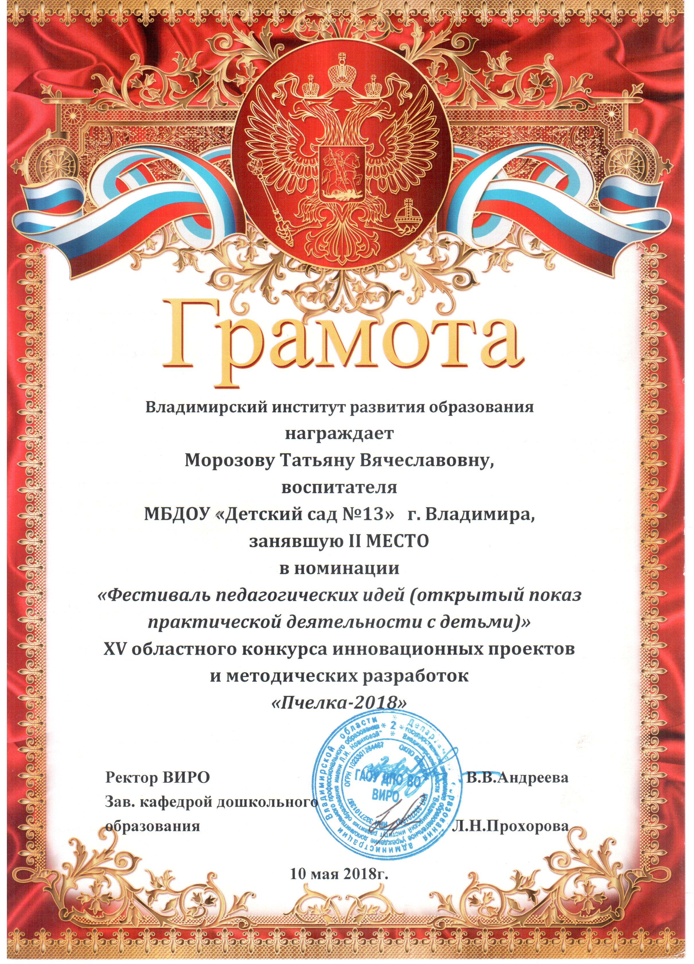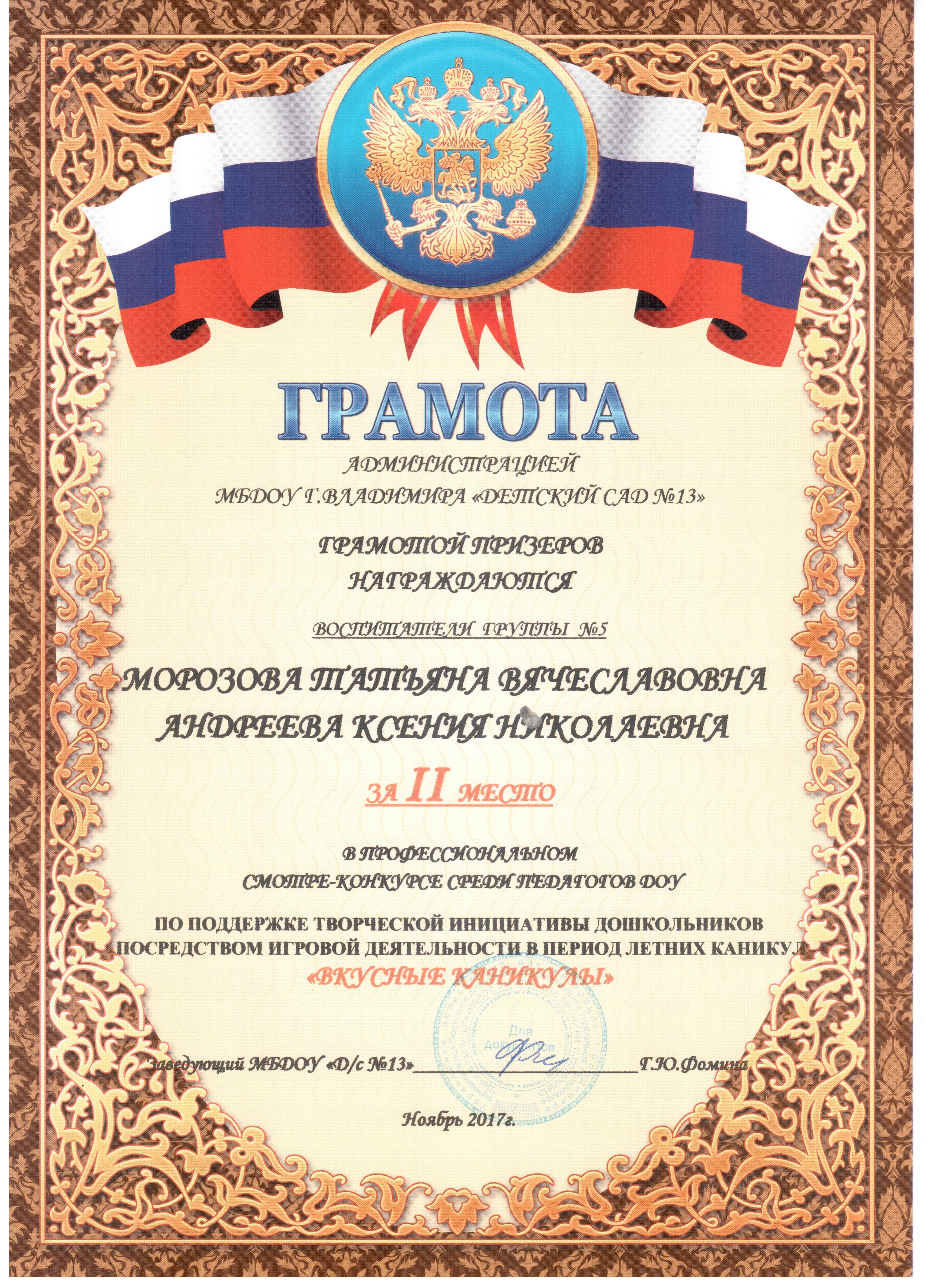 - 2018г. (май) - Благодарственное письмо администрации МБДОУ «Детский сад №13» г.Владимира за профессиональный, добросовестный труд и хорошую подготовку детей к школе;