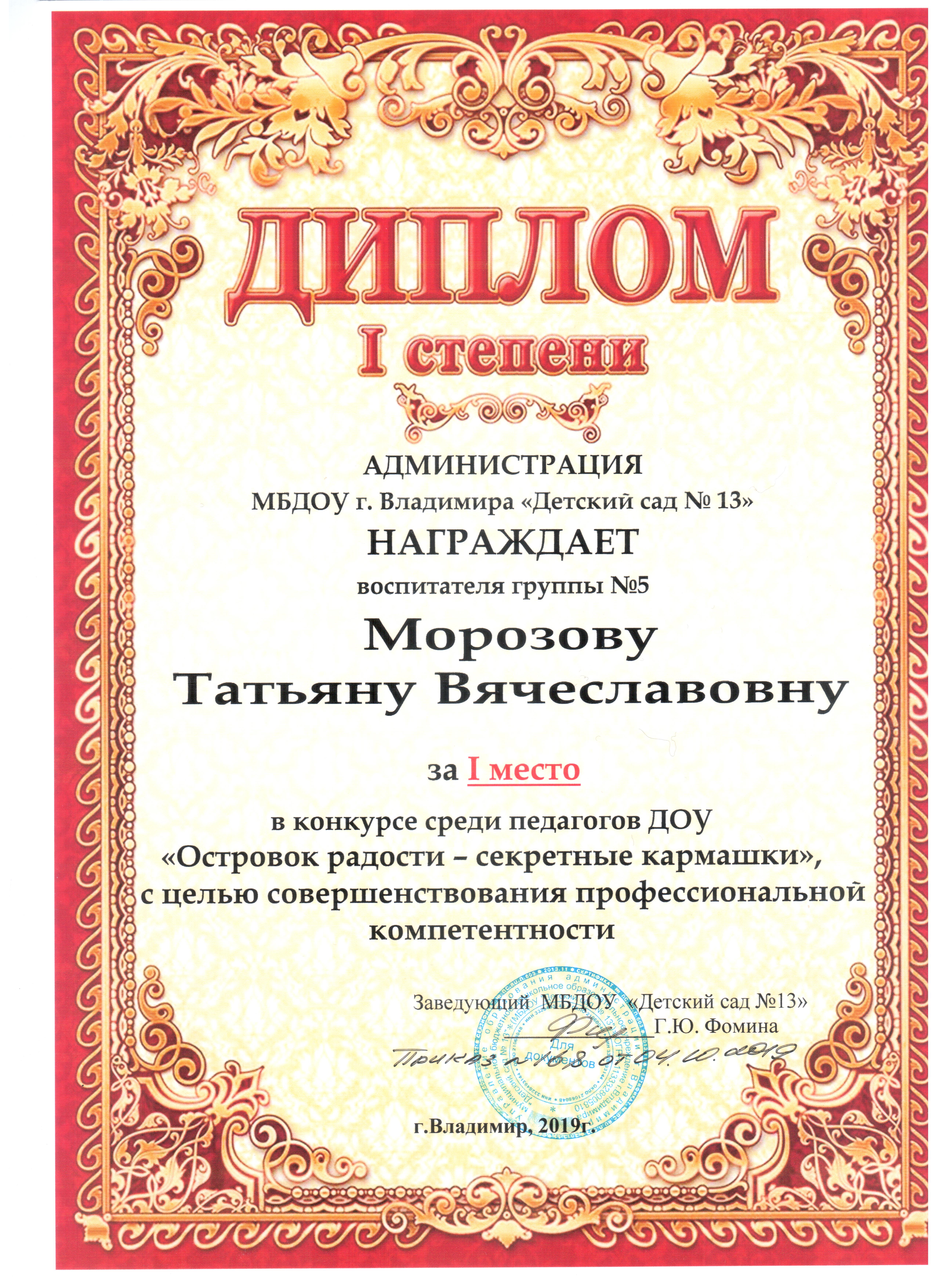 - 2019г. (май)- Благодарность администрации МБДОУ "Детский сад №13" г.Владимира за помощь в создании условий для проведения мероприятий XVIIIконкурса "Педагог года Владимирской области";
